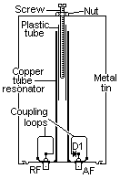 The drawing gives the mechanical construction of a cavity which may be built using household "garbage". Coffee tin's, Milk tin's or even an old galvanised dustbin have all be used sucesfully in this project. A 20dB commercial preamp in the antenna lead will increase the sensitivity, and the "shack" stereo amp forms the audio stage. Connect the output of the cavity to the PHONO input of the stereo amplifier. There is normally sufficient gain in the average stereo amplifier for this purpose. In the circuit RF is the antenna input. AF is the audio output to the stereo. D1 is a germanium signal diode (or better).