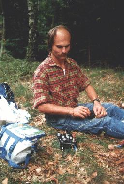 Peter, DF6IN from Mannheim, Germany and a member of the G QRP Club, sent me this photograph of himself operating froma portable location. The rig shown was a home brew 7 mhz transceiver, 3 watts output on CW. Peter was using a 21m long wire with two 10m counterpoise wires.