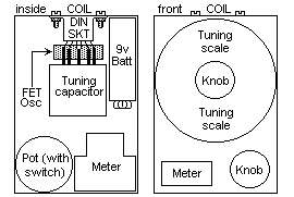 Mount the tuning capacitor about 1cm above centre of an aluminium box, 8cm x 6cm by about 3cm deep. Connect the four tuning capacitors to the DIN socket by means of 2mm Dia copper wire (robbed from a bit of house wiring cable). Connect the DIN socket earth (chassis) pin to the earth tag of the tuning capacitor. Connect both C2's (10n + 1uf) between the DIN socket pin 2 and the earth bar. Mount the components for the FET oscillator in "rat's-nest" fashion as close to the tuning capacitor as possible. All component leads must be clipped as short as possible in order to get performance up to 460 MHz. See below for the layout and front view of the unit.