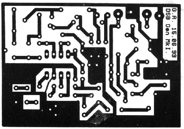 I use methods "a" and "b" (mainly because I am not a millionaire - yet). The figure above contains a PAINTBRUSH pattern with the correct component spacing for ICs and standard pads for resistors. The little single dots give you markers on a 0.1" matrix for planting pads using cut'n-paste. Print the finished file reduced to 24%, on tracing paper (ink-jet printer) or OHP film (Laser printer). Draw the artwork so that your view of the is from the top (component side) of the PCB. Exposure Expose the PCB in a custom made printing frame. Build up a sandwich of (top to botom) glass, artwork, copper-clad board and a bit of chip-board (wood). The artwork must be inky-side down. The copper-clad board must be sensitive side up. Expose for 2 HOURS 10cm from an 18 watt flourescent tube. You will have a even and uniform exposure if you position the tube over one side of the board for 1 hour, then the other side for the other hour. Developing I use one cup of Caustic Soda crystals, dissolved in two cups of water as a STOCK developer solution. Use 1ml of this to each 60ml of water to make a working strength developer. Immerse the board in working strength developer and the exposed coating will dissolve in seconds. Wash the board very well as small traces of soda can contaminate your etchant. * WHEN MIXING STOCK SOLUTION OF DEVELOPER, MUCH HEAT IS GENERATED. ADD SODA VERY SLOWLY AND A SMALL AMOUNT AT A TIME. ETCHING Place the board with resist in a vertical tank filled with etchant solution (normally 1/2 Kg Ferric Chloride to 1 liter of water). The board should be totally emersed and vertical. This will ensure that bubbles are allowed to rise and the sedement is allowed to fall. I usually support my boards using plastic clothes pegs (clothes pins). My etching tank is a stout plastic bag in a wooden former. The front of my tank is replaced with perspex sheet so that I can see the board etching. Etching is complete when all the unwanted copper is dissolved. Wash the board thoroughly after etching is complete. When you first put the board in the tank the copper will turn a dark colour where it is exposed. If bits of WANTED copper turn dark then the board may be removed, washed and touched up with a DALO pen. If UNWANTED copper stays nice and shiny then the board may be removed, washed, and carefully scraped free of the grease or resist that is where it should not be. The board will normally etch within 15 minutes, less if the etchant is warm during etching. Save etchant for re-use on the next PC board in a tightly stoppered bottle. When the etchant is almost exhausted the etching time is increased. If etching takes longer than two hours then adding a little salt to the etchant will speed it up a little. AND FINALLY (a word of warning - take this seriously) Ferric Chloride etchant will stain clothes, carpets, sinks, skin, the wife, the children and the cat. It is also poisonous and kills 99% of household plants. !!! FERRIC CHLORIDE CAN SERIOUSLY DAMAGE YOUR MARRIAGE !!!