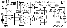 This circuit may be used to eliminate an unwanted carrier when trying to copy weak stations. Direct Conversion receivers in particular will benefit from this addition as these receivers have quite a wide bandwidth and receive both sidebands. A carrier present in the unwanted sideband can render the wanted signal inaudible, especially if the wanted station is quite weak. This circuit is very simple and is based upon a Wein-Bridge network. The Op- Amp provides anti-phase outputs to the two filter elements, and also buffers the filter output from the load. The 100K ganged Potentiometer controls the notch frequency and has a range from about 75Hz to 15KHz or so. The 50K pot compensates for any imbalance of level at the filter output. By adjusting the 2 pots in turn, it should be possible to totally eliminate an unwanted signal from the receiver output. The circuit has no gain and should be used between the receiver volume control and the AF amplifier. CW-FILTER