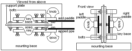 The paddle key can also be made up cheaply by using two of those small cheap ex-government keys that are almost too small to use. Bolt them together, base to base and mount vertically. You will then have one key to the left and one to the right. Fit two perspex paddles under the knobs. Works fine, especially if the base is quite heavy. A 1cm x 12cm x 7cm block of aluminium or brass is quite heavy enough. Four rubber feet complete the job. Have fun, de HARRY, Upplands Vasby, Sweden
