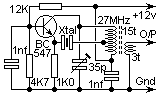 Above is the circuit diagram of a VHF 145MHz oscillator that can be used to receive the 2 meter band. The crystal is a 2-meter 8MHz type (Kenwood 2200) but 12MHz crystals will work equally well in this circuit. If you want to receive 145.750 use a TX crystal from 145.250 - 145.300 (RTTY channel). Tweek the two IF cans (change the IF) to peak the channel required.