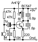 If you wish to use it from the headphone socket of an HF rig then delete the first 47K resistor and reverse the 1uf capacitor. The circuit shown is for an Electret condenser microphone. The transmitter may be received by any VHF FM radio, but the pocket radio I use about the house was free with WEETABIX box- tops a few years ago. It should have a range of at least 250 feet (75 meters) but increase the "220 ohm" emitter resistor to 1K to reduce the range (if you think that little Johnny could plant it in you and your wife's bedroom).